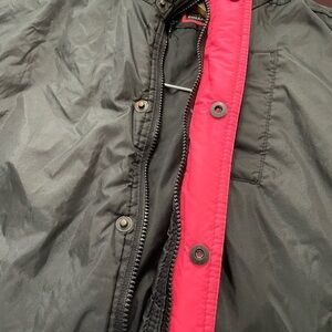 Milano Bay women’s three tones size medium winter jacket. Colors black, gray and pink. It is zip up and snap buttons closure It has tree pockets at front and one inside.. it is high neck, elastic waist also sleeve has elastic seam pi to pit 25” length 24” sly21.5” pre owned great condition except as the picture shows has a small rip at the seam and liner at the back. Not hard to fix