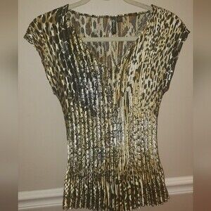Milano Black & Gold Pleated Short Sleeveless Shirt Fabulous Print Ladies Small