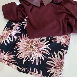 Siani Milano holiday sweater in a dark beautiful color somewhere between dark plum and black rose. Faux leather pointed collar that buttons in back and shirt cuffs in matching sweater color. Sweater is super soft. Tags cut but did not fit, so was not worn at all.