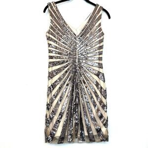 This sleeveless design features a flattering V-neck and V-back, with striped sequin details that shimmer all over the dress. It is fully lined for comfort and has a hidden back zipper closure for a smooth fit. The dress is made from polyester and includes padded bra inserts sewn inside for added support. Perfect for making a statement, this mini dress combines glamour with a chic, form-fitting silhouette.