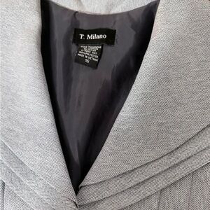Chic gray pencil skirt suit by Milano. Perfect for office wear. Stylish and professional.