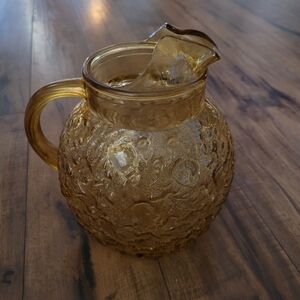 Excellent pre owned condition. Milano Mid Century Modern Crinkle Glass Pitcher in Amber. Ice lip. 22" circumference. 8" Tall. Milano Lido Anchor Hocking Desert Gold 96 Oz. Ball Pitcher 1960s Vintage Amber