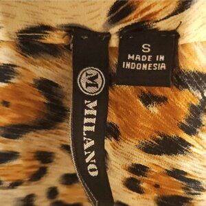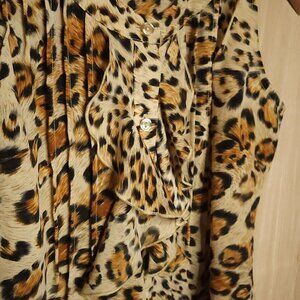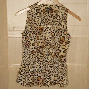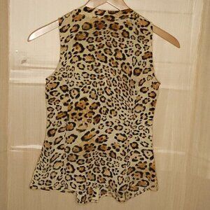 Milano women’s brown black leopard print ruffle front sleeveless blouse small. Gently used condition. Measurements are: 23 ½" from shoulder to hem and 19 ½" from armpit to armpit.