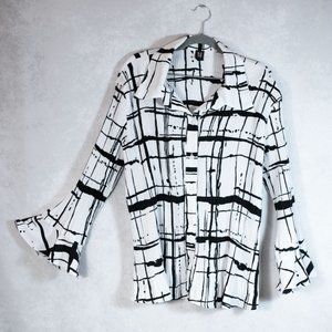 Milano Womens Ruffle Pleated Button Down Shirt Flare Cuff Sleeves White/Black Size 1X