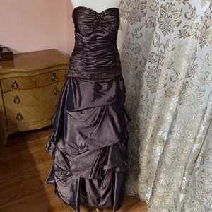 Sweetheart cut dress by Milano. Shiny brown in color. Worn once and been dry cleaned. In excellent condition. Bought large but taken into medium.