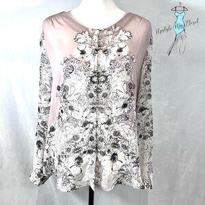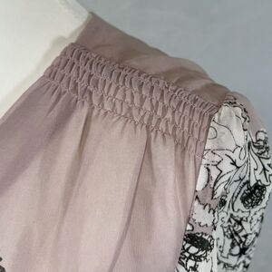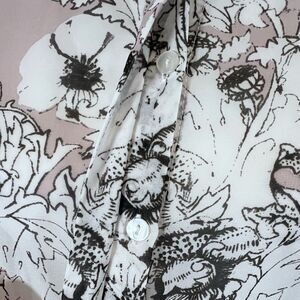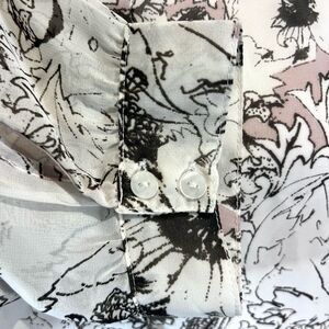 Covered button down front lightweight blouse. Smocked shoulders. Slight elastic banding at the waist in the back for aflattering fit. EUC
