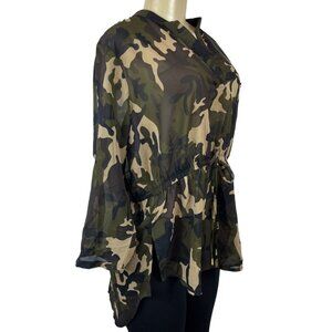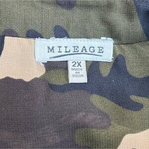 Mileage presents a Women's Green Peplum Blouse in size 2X. This military-patterned shirt features a v-neck, collar, sash, and three-quarter sleeves. Made of durable polyester. It is in excellent used condition with no holes, rips, or stains. Please refer to the pictures for details. Measurements are shown in the last image.