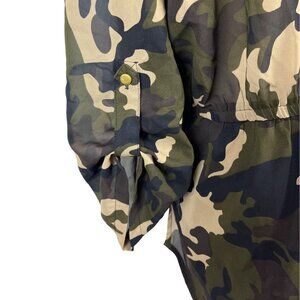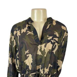 • Style: Military patterned shirt with v-neck, collar, sash, and three-quarter sleeves