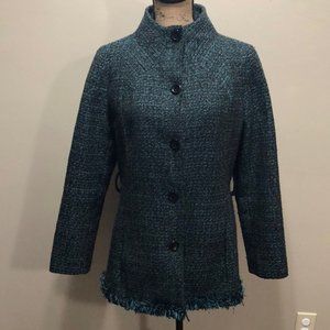 Green mixed tweed knit jacket coat. Button front closure. Fully lined. Fringed hem. There are loopholes for a belt but belt is NOT included.