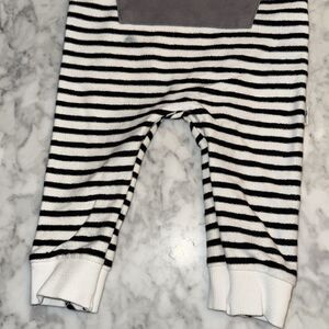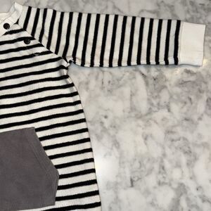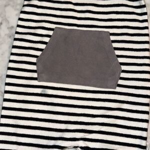 Adorable striped baby outfit with a front pocket. Features black and white stripes with a gray pocket.