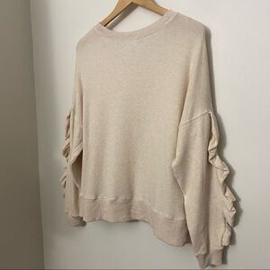 A comfy oversized sweatshirt with a difference-soft ruffles down the sleeves and front. Very pretty cream with LIGHT pink speckles. Soft comfy fabric! The perfect tomboy-meets-girl top. Oversized fit.