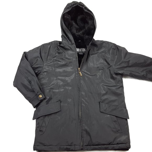 Miletta Women's Size Small Full Zip PVC Hooded Coat , Black Faux Fur Lining