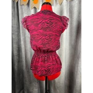 Miley Cyrus Max Fuschia Black Zebra Rouched Ruffle Blouse Size S Sheer Top