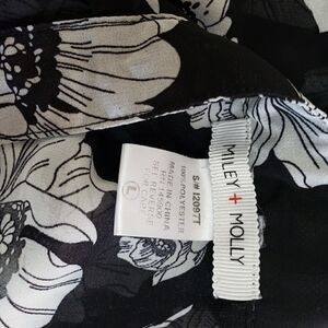 Black with oversized graphic floral design open front with criss cross detail. Tab sleeves, sheer