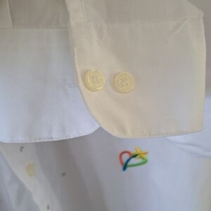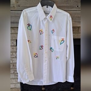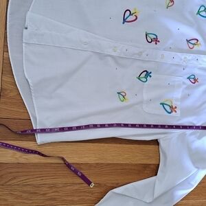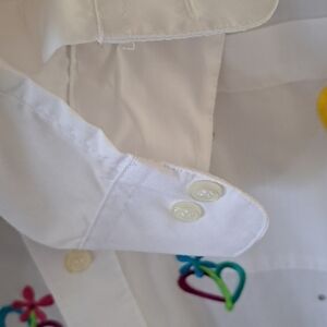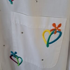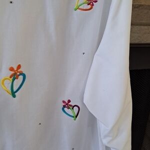Mili Designs women's size large white long sleeve button-up shirt with brightly multicolored flowers hearts and Jewels Material tag has been removed See pictures for small discoloration and writing on inside lower part of shirt that gets tucked in Lagenlook Coastal Grandma Artsy Art to wear