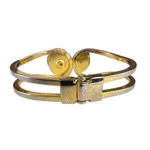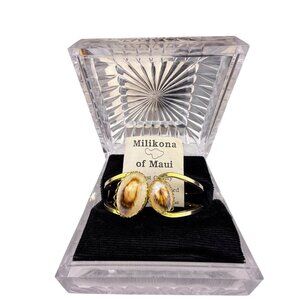 This Milikona of Maui bracelet is a stunning example of vintage-inspired craftsmanship. Made in Hawaii, this piece showcases two delicate shell accents set on a gold-tone double cuff frame. The shells exhibit a natural, earthy gradient that enhances the tropical allure of the design. The bracelet is hinged for secure yet easy wear, designed to fit most wrists comfortably at approximately 6.5 inches in circumference. The gold-tone finish adds a touch of elegance while creating a charming contrast against the organic shell detailing. Its timeless design captures the essence of island life, making it a thoughtful keepsake or a unique addition to your accessory collection. The bracelet is presented in an ornate acrylic storage box with black velvet padding, reflecting the care and thoughtfulness of the artisan’s Hawaiian inspiration. Perfect for collectors and enthusiasts of Hawaiian artistry and beautifully handcrafted jewelry items, this piece embodies a story rooted in culture, tradition, and the captivating aesthetics of nature.