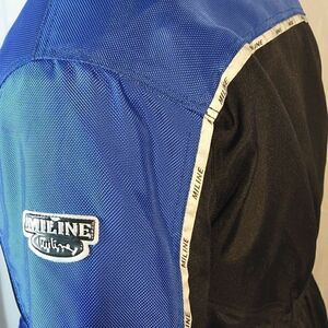 This Permer Tex black and blue nylon Miline Wilier "Cruiser" motorcycle jacket with protection is a size 56 with a pit to pit measuring 25" and a length of 26". It had multiple pockets with Velcro closure. It has a quilted removable liner. Shoulder and back protection plates. In like new condition. All offers are welcome.