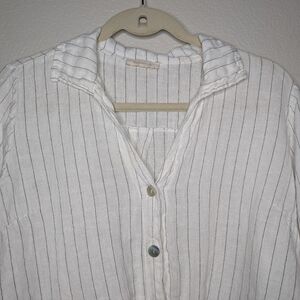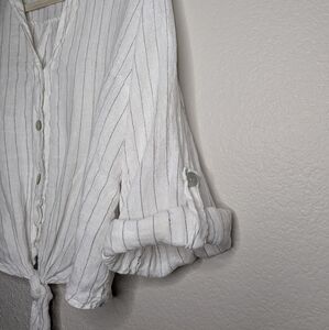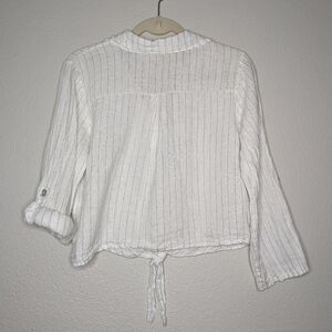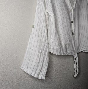 Long sleeve crop shirt with pointed collar. Button up closure, knotted detail, roll tab sleeve, oyster shell buttons. 100% linen, made in Italy. Gently used, women's size large L.