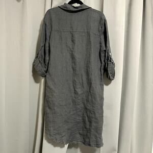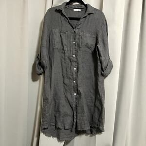 Milio-Milano 100% Italian Linen Button Down Mid-Length Army Green Shirt Dress - featuring a classic button down front, button up sleeves, chest pockets, a collar and a fringe bottom hemline. Color is a greenish gray. Some very light wear, overall in good condition!