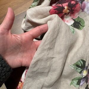 This lovely linen dress will be so cute for summer (or a winter vacation). Sleeves can be worn rolled up or down. It has pockets! One tiny knot in the fabric on the front. I don’t think it detracts. Please see photo. Size medium, but I’m a medium and there is room to spare.