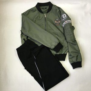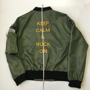 Military bomber jacket with patches and embroidery words. Fully lined, light weight. Pocket on the left sleeve functional. Excellent used condition, no defect, only worn few times. Forest /military green. First picture shows similar jacket and styling only.