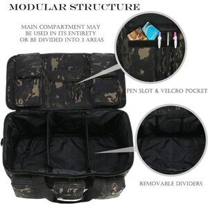 🧿【Molle Modular Design】Heavy duty duffel bag with Molle webbing system on front and top, which designed for the modular attachments, attaching extra tactical pouches or gears, such as kettle, walkie-talkie, first-aid pouch and so on.