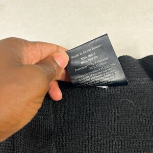 Classic military-inspired black cardigan sweater with button front, utility shoulder and elbow patches, and wool blend warmth. Minor fuzz visible — a timeless versatile piece for casual or smart-casual wear.