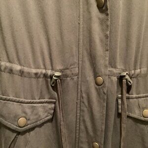 Drapey fabric, zipper and snaps, tab roll cuffs, slash pockets drawstring waist. Good condition.