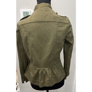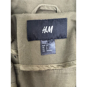 Command attention in this statement olive green military-inspired blazer by H&M, featuring structured shoulders, epaulets, and dramatic double rows of antiqued metal buttons. The fitted cut flatters your shape while the open front design adds effortless layering versatility. Perfect for channeling punk, steampunk, or regencycore vibes--whether styled over jeans for casual edge or a maxi skirt for romantic drama.