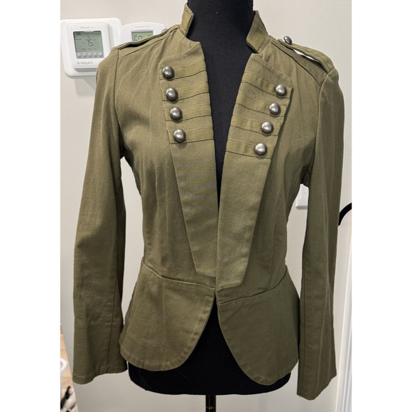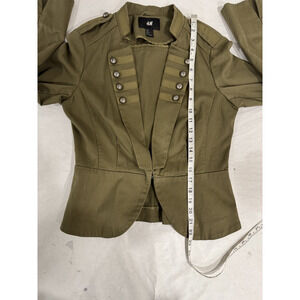 Command attention in this statement olive green military-inspired blazer by H&M, featuring structured shoulders, epaulets, and dramatic double rows of antiqued metal buttons. The fitted cut flatters your shape while the open front design adds effortless layering versatility. Perfect for channeling punk, steampunk, or regencycore vibes--whether styled over jeans for casual edge or a maxi skirt for romantic drama.