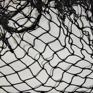 Vintage black fish net from military surplus stock, weighing approximately 1.25 lbs and consisting of two unevenly cut pieces. Estimated dimensions are roughly 4 feet by 2 feet per section, though actual size may vary due to irregular cuts. Constructed from durable synthetic mesh, suitable for repurpose, display, or field use. Originally intended for cargo containment, camouflage, or maritime training applications. Sold as-is for collectible or utility value.