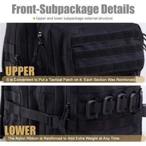 🧿This Black Tactical Backpack Molle tactical backpack has molle system, Molle webbing throughout for attaching additional tactical pouches or gear.MilitaryTactical backpack with double-stitched, Heavy duty zippers and utility-style cord pulls, Side and front load compression system, mesh padded back area & shoulder strap.