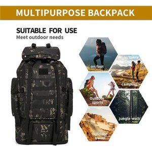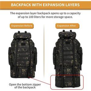 - Large Capacity Rucksack: The ripstop survival rucksack with expansion layers, up to 100L Capacity when Opened for more storage. The tactical backpack features spacious compartments and 2 side pockets to keep your belongings organized. The main pocket of the backpack is designed with a drawstring to make it easier to get things.