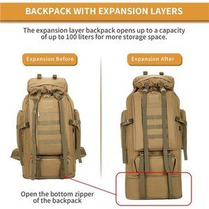 - Large Capacity Rucksack: The ripstop survival rucksack with expansion layers, up to 100L Capacity when Opened for more storage. The tactical backpack features spacious compartments and 2 side pockets to keep your belongings organized. The main pocket of the backpack is designed with a drawstring to make it easier to get things.