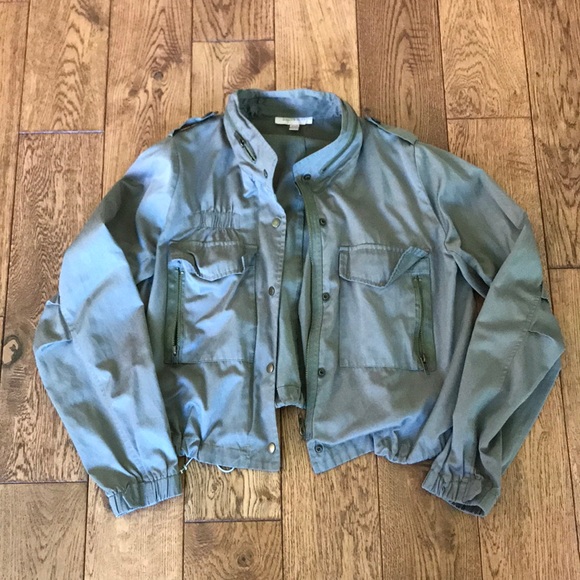 Super cute military jacket. Waist length. Zipper and button detail throughout. Close up of fabric under the arms from wear, otherwise great condition.