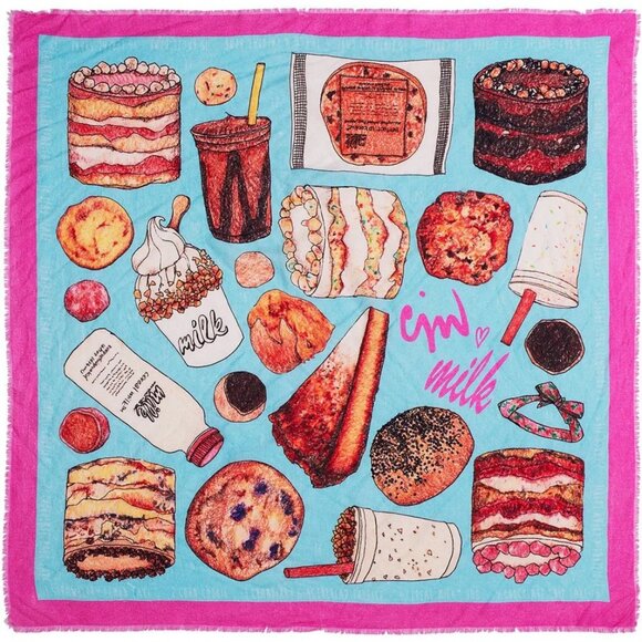 36x36" 100% Featherweight wool The CJW x Milk Bar Scarf combines artist and designer Christina J. Wang’s love of food and fashion with milk bar chef, founder and owner Christina Tosi’s delectable creations, creating the perfect accessory that can be worn in a multitude of ways. Made from 100% Australian featherweight wool, the CJW x Milk Bar Scarf looks and feels delicious.