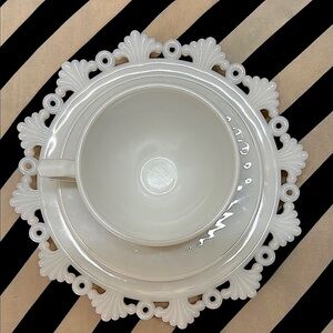 This luminous three-piece set features a teacup, saucer, and bread plate, all crafted from classic milk glass with delicate texture throughout. The standout detail is the bread plate, beautifully edged in a lace-like pattern that adds femininity and refinement. The pure white finish and intricate detailing evoke timeless elegance—ideal for cottage-style tea service, display, or as a thoughtful vintage gift.