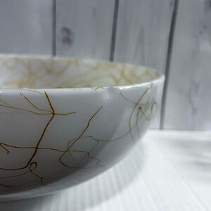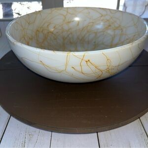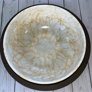 Hazel-Atlas bowl in a contemporary swirl pattern, made of glass. Butterscotch and white milk glass with a drizzle string pattern design. 10"dia x 4" high