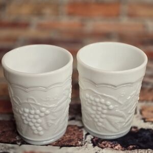 Vintage milk glass set of two grape motifs tumblers. Tumblers measure approximately 4 inches.