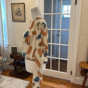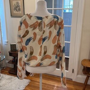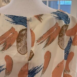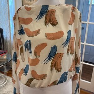 Milk & Honey abstract print women’s top. Elevate your style with this chic women's top featuring an abstract print. The blend of cream, blue, and brown colors adds a modern touch to your wardrobe. Polyester. Elasticized waist. Size L. Measurements are 22” from armpit to armpit and 19” long.