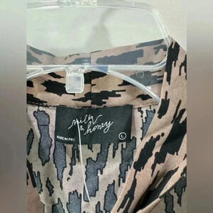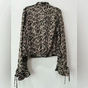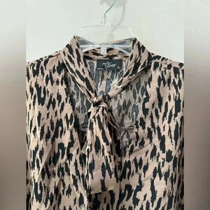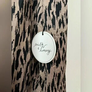 Elevate your wardrobe with this stunning brand new Milk & Honey black and tan print blouse. Made from 100% polyester, this blouse features ruffle cuffs and a tie at the neck for a sophisticated touch. The long sleeves make it perfect for any season, and the hand wash care instructions make it easy to maintain. This blouse is a size L, offering a comfortable and flattering fit for a variety of body types. Whether you're dressing up for a special occasion or adding a touch of elegance to your everyday look, this blouse is sure to turn heads. Don't miss out on adding this versatile and stylish piece to your collection!