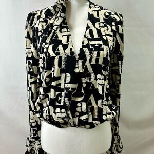 Chic blouse with a striking black and white pattern letters. Perfect for a stylish look. In great condition size medium long sleeves ties around neck you can either do a bow or a knot Brand is Milk & honey