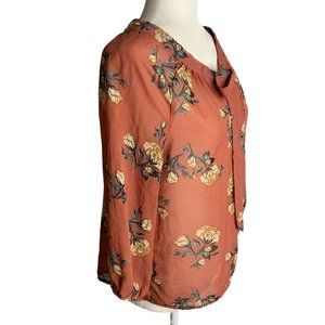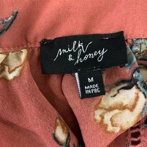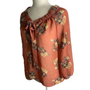 Milk & Honey Boho Floral Blouse M Dark Pink Tie Neck Sheer Balloon Sleeves