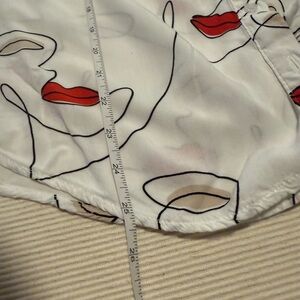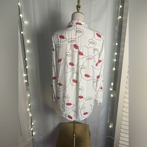 This relaxed button-down shirt features a playful red lip pattern on a crisp white background. The notched collar and long sleeves add a touch of classic style to this eye-catching top.