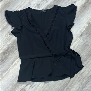 Elegant black faux wrap tie top with ruffled flutter sleeves and eyelet detailing. Perfect for any occasion.