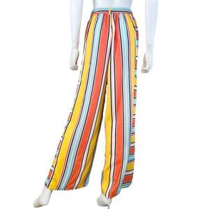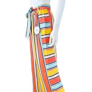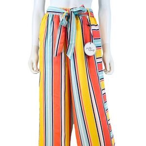Milk & Honey Striped Wide Leg Pants. Functional front pockets. Self tie waist with belt loops. Relaxed fit. Linen-like material. Color: Mango / Aqua.