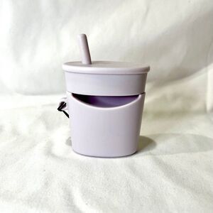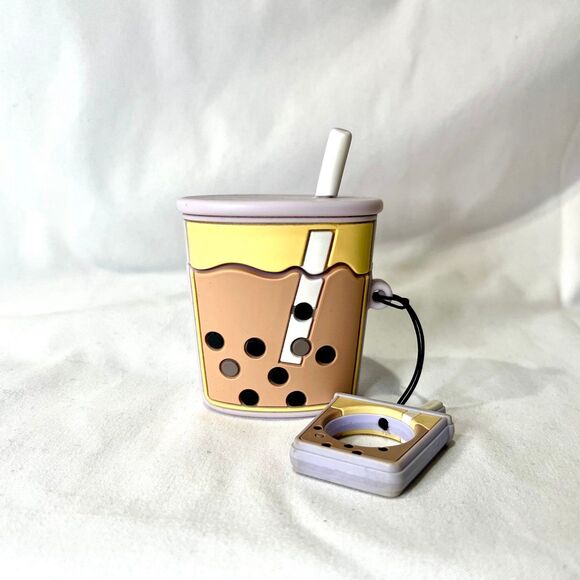 A silicone AirPods case with a cute boba-inspired shape and a purple background. It has a removable silicone key ring to make it easy to carry around. Compatible with AirPod Generations 1 & 2.