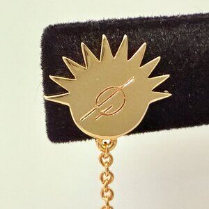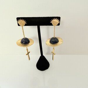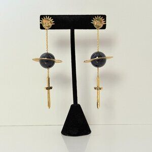 Unique planetary-inspired earrings with gold-tone sunburst studs, black planet orbs with subtle glittery sparkle, and dangling daggers for bold, celestial style.