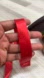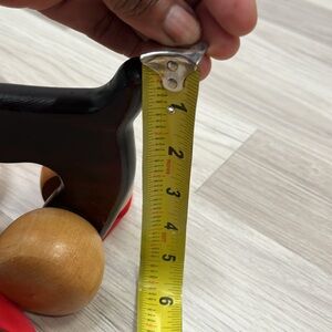 Charming Dark Brown wooden dog pull toy with a vibrant red ribbon. Features wooden wheels for easy movement. Has small glue spot on ribbon not noticeable