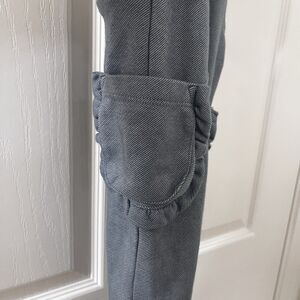 Milkbarn Denim Ruffle Overalls Girls Size 12-18 Months. Adorable little overalls, kinda a blue-grayish color. Soft fabric, Milkbarn calls these "denim", but the denim does not feel like typical denim. Adjustable straps and pockets. The legs DO NOT have snaps. Have been worn, but no issues that I can find. Good Used Condition.
